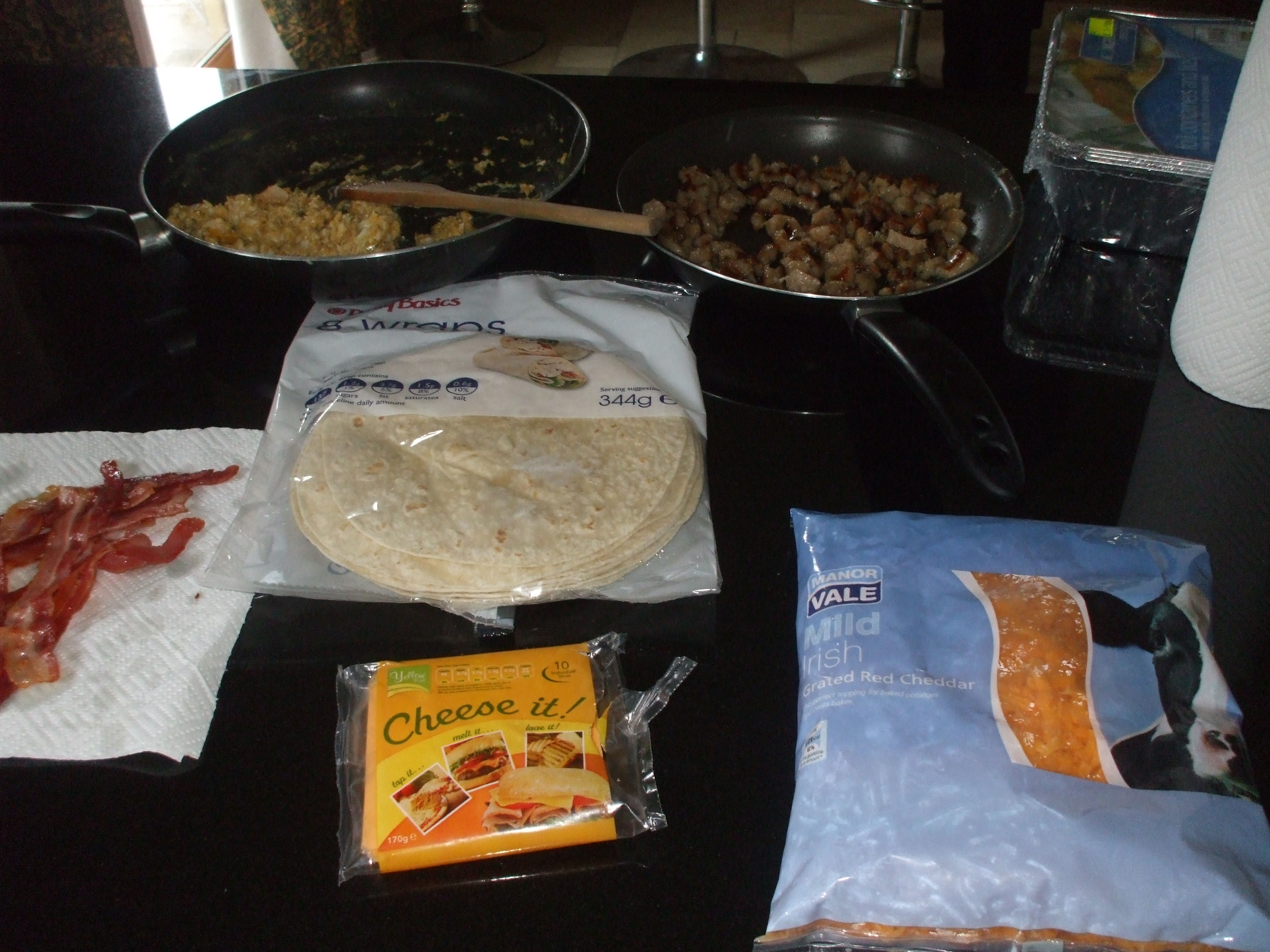 Preparation: I started by frying the bacon on medium-low temperature (so as not to overcook it). I chopped up the breakfast sausage into small pieces and fried it on medium-low temperature as well. When the meat is done, I remove the pans from the heat and drain the bacon on paper towel. You can drain the sausage too, but I did not. I cut each strip of bacon in half lengthwise and then chopped into small pieces or bits. I scrambled the eggs in the same pan I fried the bacon in (drain any grease beforehand) and salt and peppered to taste. I added a small amount of milk to my scrambled eggs too.