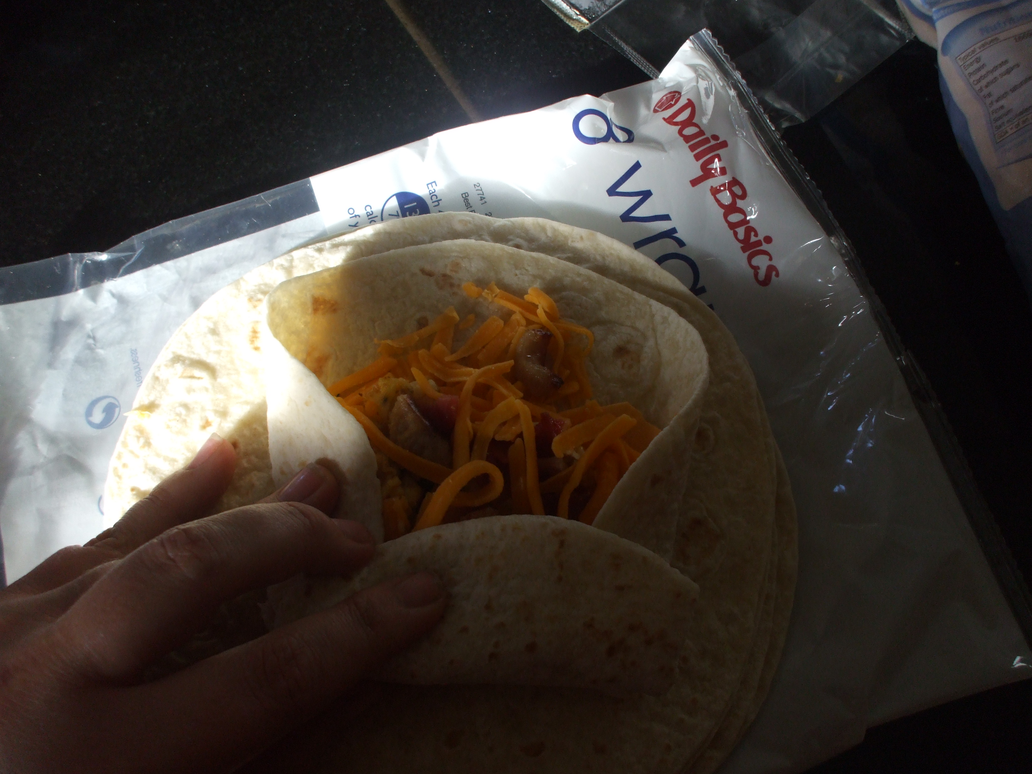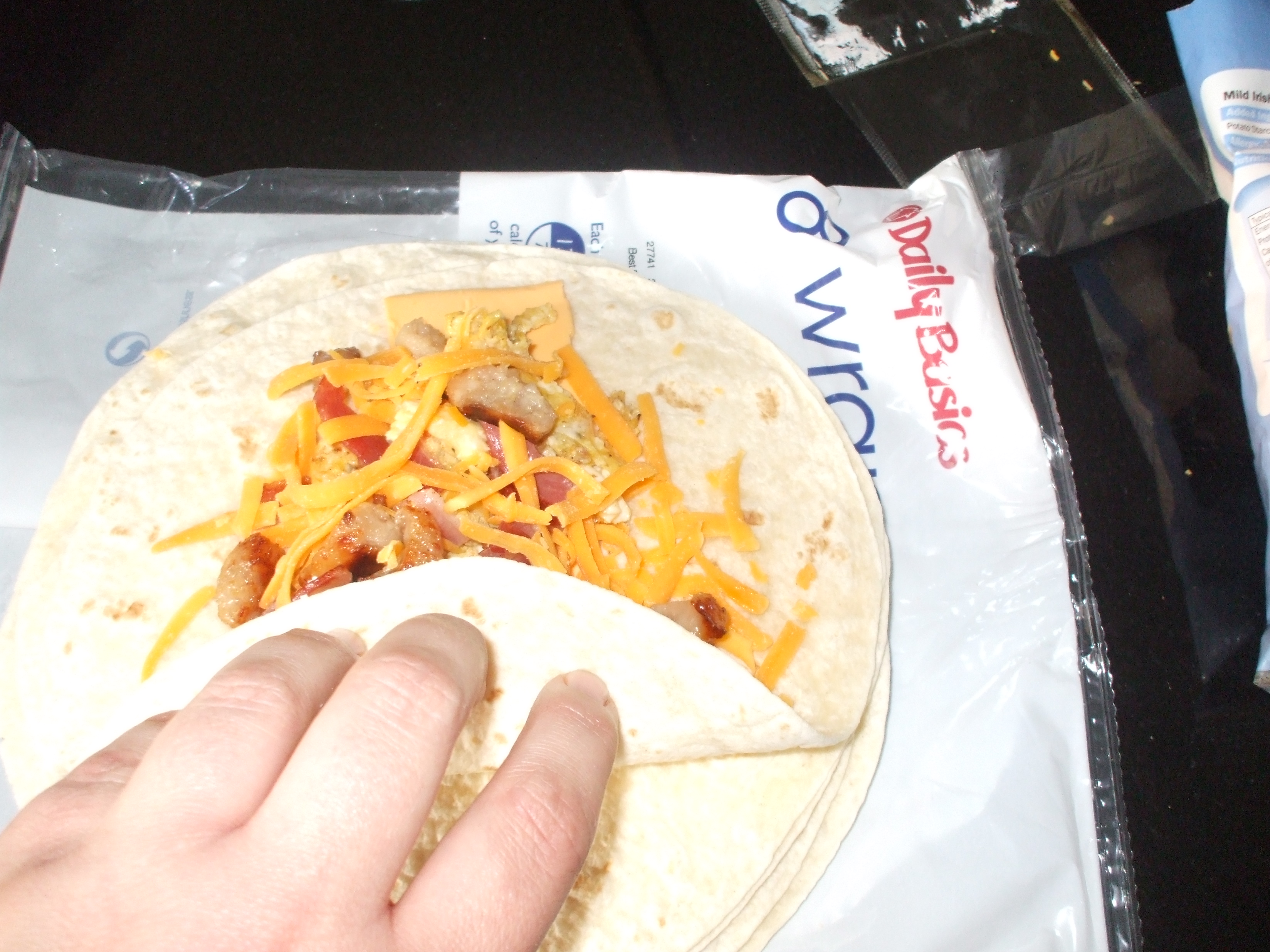 I tore one piece of processed cheese in half and laid one near the bottom and one near the top of an open tortilla shell. Next, I added equal portions of egg on top of the cheese. Please note that you can sprinkle a bit of shredded cheddar around at this time as well. The cheese will help keep everything together. Finally, I spread equal amounts of bacon and sausage on top and finished off with more shredded cheddar cheese.