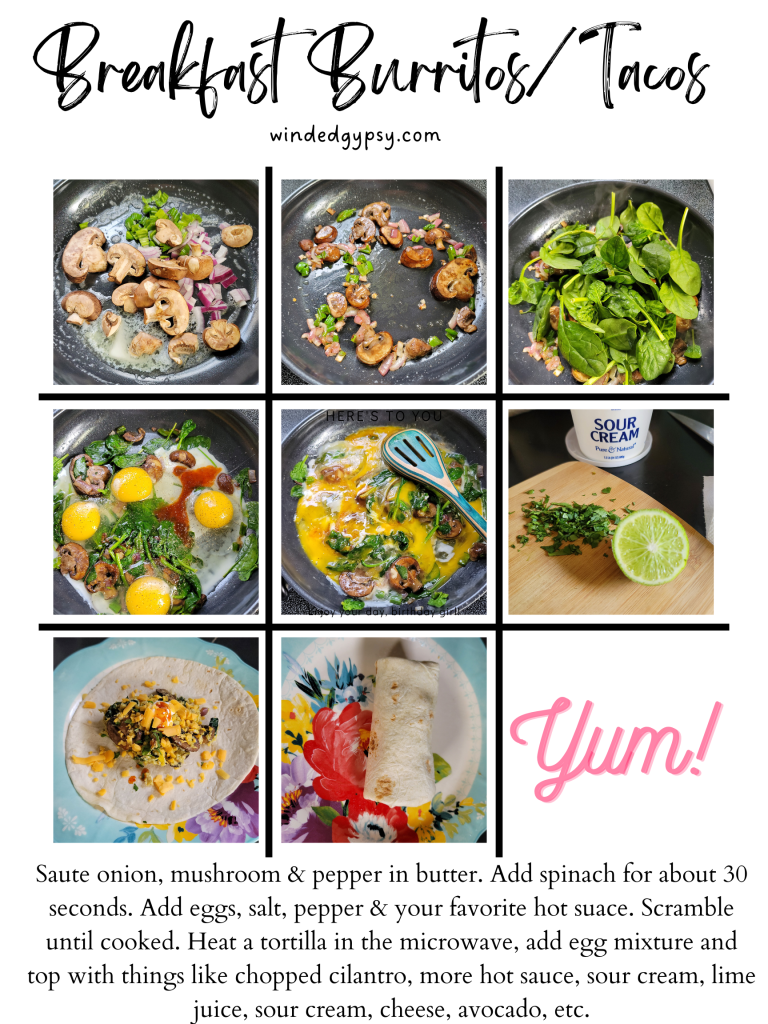 I love a good breakfast burrito or taco. Usually they’re stuffed full of scrambled eggs, cheese and some sort of breakfast meat, like bacon or sausage (or both). There are times I don’t have time to cook up a bunch of meat. Meat isn’t the cheapest these days either. I also find myself looking for a filling and satisfying meal I can make for one during the middle of a busy work day (I work from home). A few years ago I started creating an easy meal from ingredients I generally have on hand: