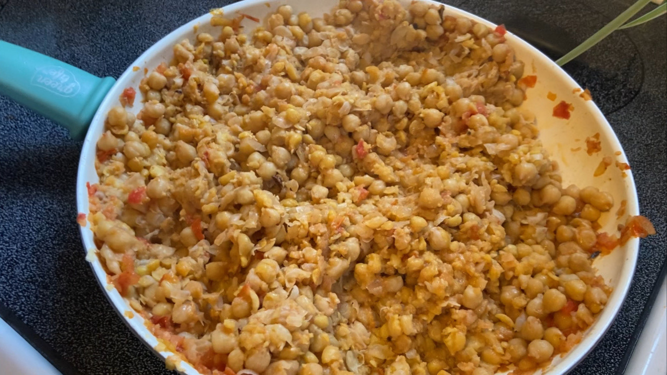 - Add the chickpeas and stir-fry for 5 more minutes, mashing the chickpeas with the spoon as you stir. When the chickpeas are coated with the spices, remove from the stove. Garnish and serve at room temperature. Serves 4.