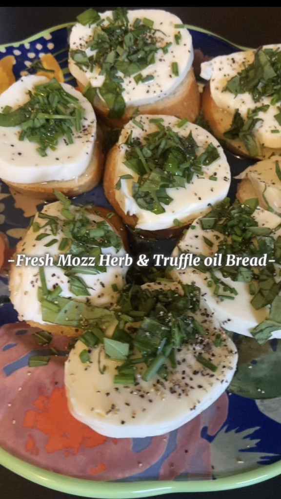 Use a bread knife to slice the bread into 1/2-inch slices and set aside. Slice enough mozzarella slices for each slice of bread. Finely chop the basil and chives. Layer each slice of bread with a slice of mozzarella and then drizzle with the truffle oil. Sprinkle a mixture of the chopped herbs on top of the oiled cheese (the oil helps the herbs stick). Sprinkle with salt and pepper to taste.